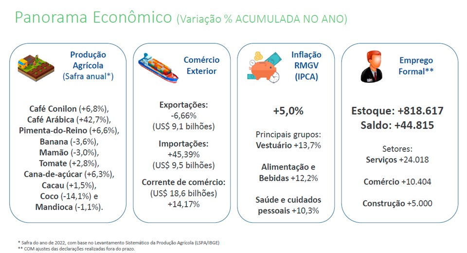 Entre os principais destaques estão a alta de +14,1% na corrente de comércio, movimentando US$ 18,6 bilhões entre importações e exportações realizadas naquele ano. Em relação ao Mercado de Trabalho, o estoque de empregos formais no Espírito Santo superou 818 mil postos, produzindo um saldo de quase 45 mil novos vínculos com carteira assinada somente no último ano.