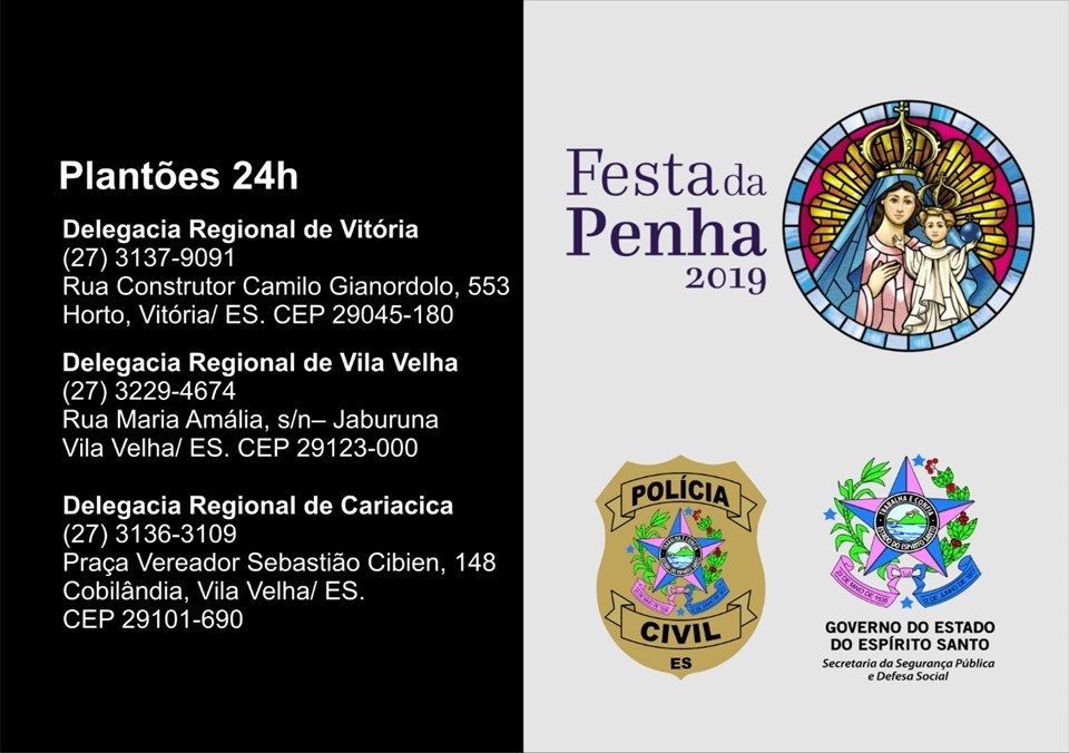 Na próxima segunda-feira (29), em razão do feriado do Dia de Nossa Senhora da Penha, Padroeira do Espírito Santo, algumas unidades da Polícia Civil funcionarão em horário diferenciado. As Delegacias Regionais de Vitória, Vila Velha e Cariacica, na Região Metropolitana do Estado, funcionarão 24 horas, em regime de escala. Já os Distritos Policiais dos referidos municípios estarão fechados neste dia.