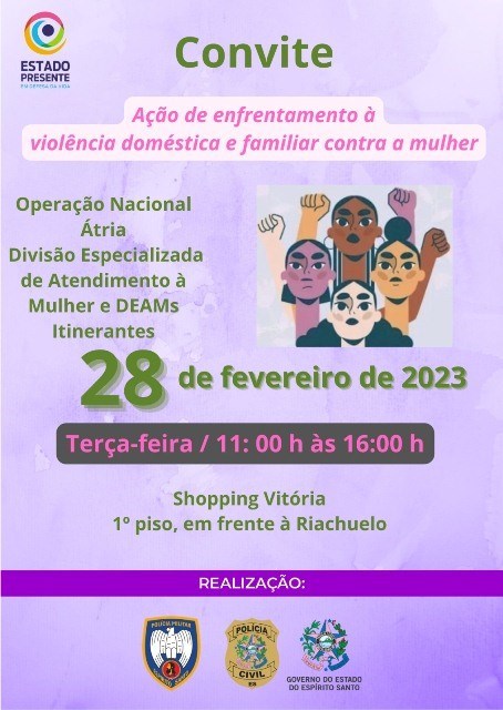 As ações ocorrerão em âmbito nacional, durante o mês março, em razão da Operação Nacional Átria, que será comandada pelo Ministério da Justiça, por meio da Secretaria Nacional de Segurança Pública (Senasp). No Espírito Santo, terá a coordenação operacional da delegada titular da Divisão Especializada de Atendimento à Mulher (DIV-DEAM), Cláudia Dematté.