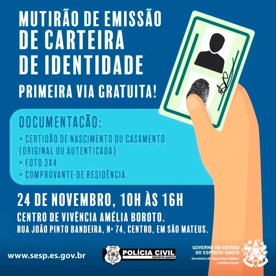 A Polícia Civil, por meio da Superintendência de Polícia Técnico-Científica (SPTC), vai realizar, nesta sexta-feira (24), mais um mutirão para emissão de carteiras de identidade. Dessa vez, os beneficiados serão os moradores do município de São Mateus. O mutirão vai acontecer no Centro de Vivência Amélia Boroto, das 10h às 16h.