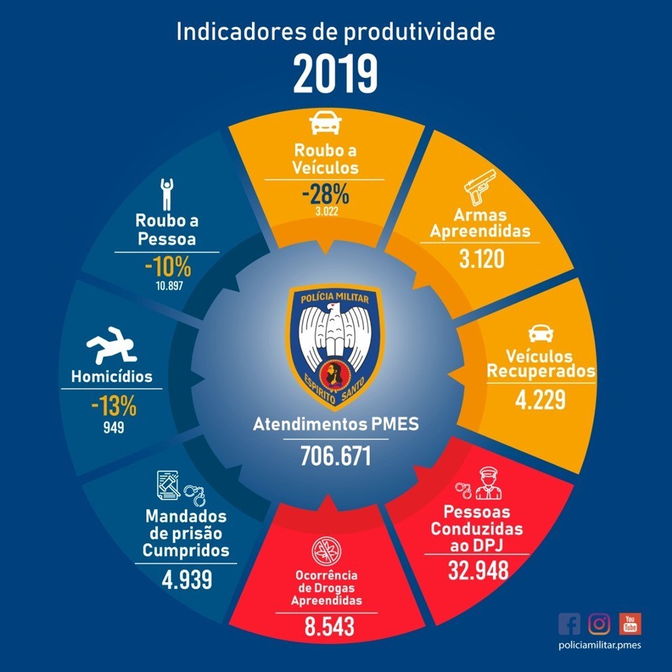 A Polícia Militar do Espírito Santo divulgou, nesta terça-feira (14), o balanço das ações desenvolvidas no ano de 2019, reunindo os indicadores de produtividade de todas as suas unidades operacionais.