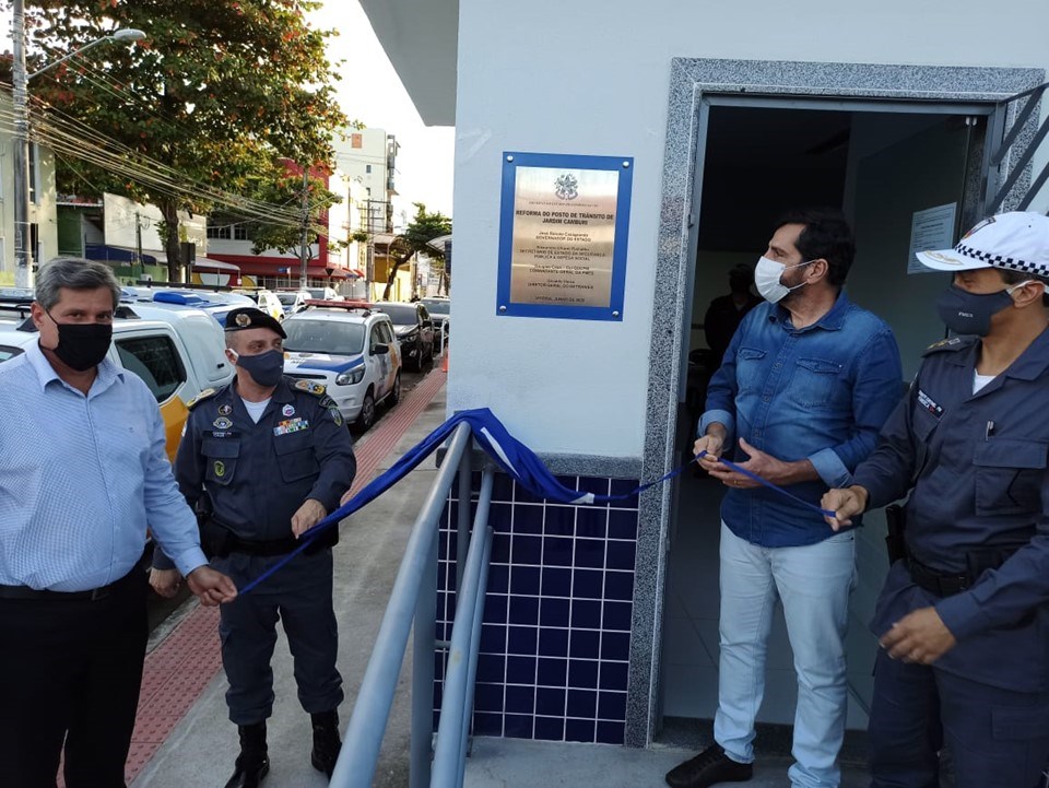 No encerramento da cerimônia, que marca o retorno do funcionamento do BP Tran em Jardim Camburi, bairro mais populoso do Estado, foi realizado pelo secretário Ramalho, o diretor do Detran|ES, Givaldo Vieira, e o comandante-geral da PMES, coronel Caus, o descerramento da placa de inauguração da unidade.
