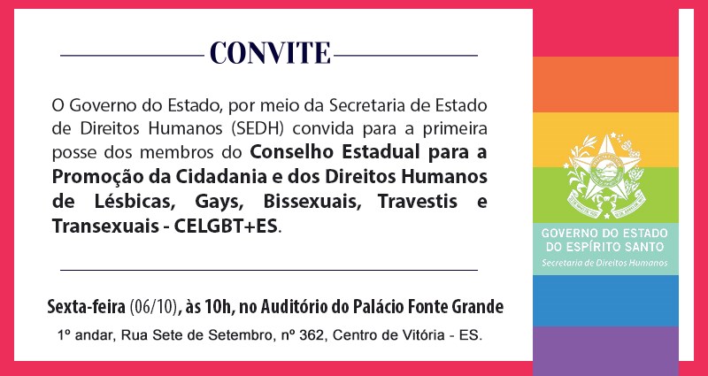 A comunidade LGBT do Espírito Santo celebra, nesta sexta-feira (06), a posse do Conselho Estadual de Lésbicas, Gays, Bissexuais, Travestis e Transexuais do Espírito Santo (CELGBT), que atuará no biênio de 2017/2019. O evento acontece a partir das 10 horas, no auditório do Palácio Fonte Grande, na Rua Sete de Setembro, Centro de Vitória.