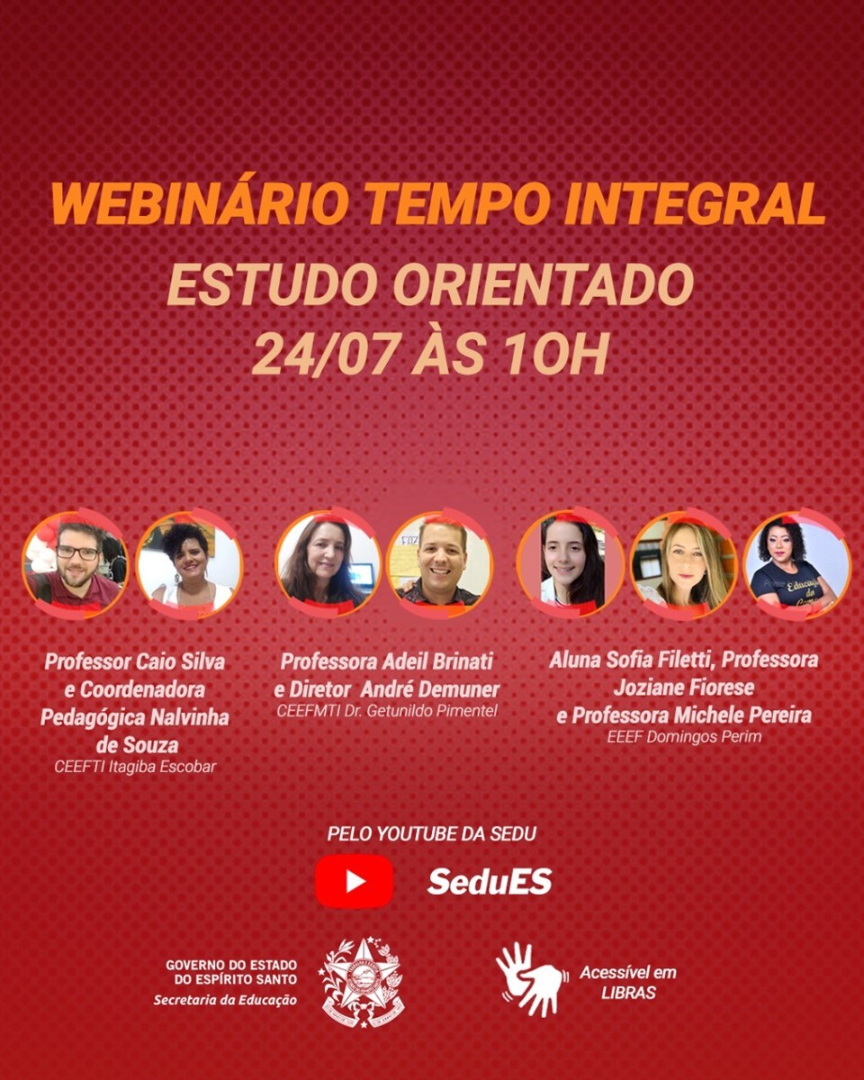 A Secretaria da Educação (Sedu) realiza, nesta sexta-feira (24), às 10 horas, o segundo webinário sobre Educação em Tempo Integral, com o tema "Práticas Exitosas em Estudo Orientado". O objetivo é apresentar metodologias a partir das práticas exitosas realizadas nas escolas da Rede Estadual, durante este período de Atividades Pedagógicas Não Presenciais (APNPs). Os convidados para o debate são alunos, professores, coordenadores pedagógicos e diretores, com mediação do assessor da Educação em Tempo Integral da Sedu, Marcelo Lema.