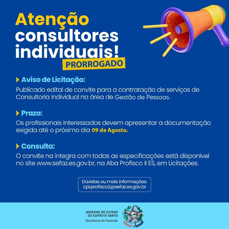 A prorrogação do prazo foi publicada no Diário Oficial do Estado nessa terça-feira (30). O convite pode ser conferido na íntegra, com todas as especificações, no site da Sefaz, no endereço https://sefaz.es.gov.br/profisco-ii.