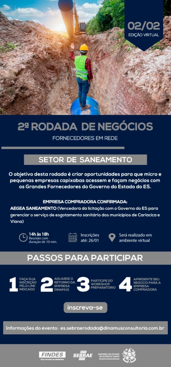 Esta será a segunda Rodada de Negócios do programa Fornecedores em Rede e ocorrerá no dia 02 de fevereiro, das 14h às 18h, com a participação de representantes da Aegea Saneamento, maior prestadora de serviço de saneamento do segmento privado no País. A companhia pretende contratar prestadores de serviço e pequenos fornecedores locais para atender às intervenções relacionadas à Parceria Pública Privada (PPP), para a execução de obras de esgotamento sanitário nos municípios de Cariacica e Viana.