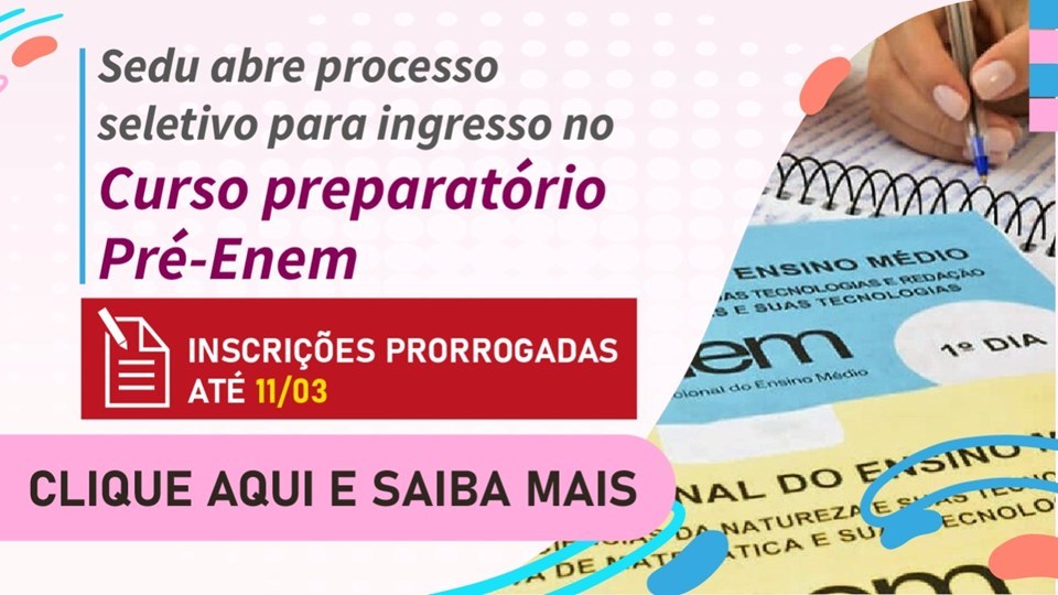 A Secretaria da Educação (Sedu) prorrogou o prazo de inscrição do Pré-Enem Digital para até sexta-feira (11). São 6.120 vagas, distribuídas nos Polos, em todos os 78 municípios capixabas. Para se inscrever no Pré-Enem, CLIQUE AQUI.