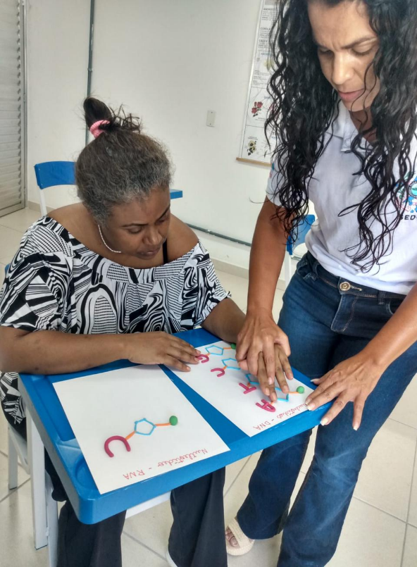Com Ivani Gonçalves, a professora trabalhou com massa de modelar e construiu o modelo da célula animal e suas organelas. Já a aluna com DV Sirleia Rodrigue de Freitas Colona, a professora elaborou o modelo da estrutura do DNA com jujubas e bala, associando o sabor às estruturas dos nucleotídeos, que foram apresentados à aluna em alto relevo.