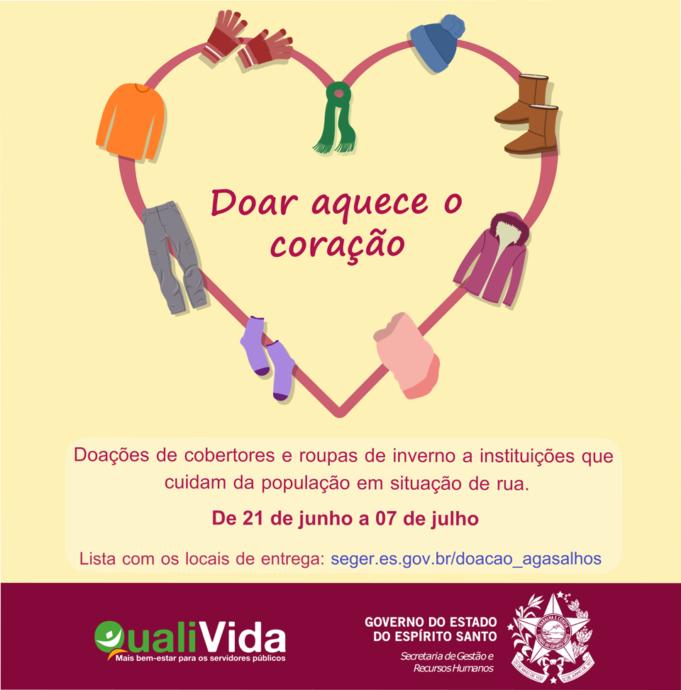 Incentivar a solidariedade e apoiar os cidadãos que estão em situação de rua. É com esse objetivo que o Programa Qualidade de Vida do Servidor (Qualivida) iniciará, nesta quarta-feira (21), a campanha ‘Doar aquece o coração’.