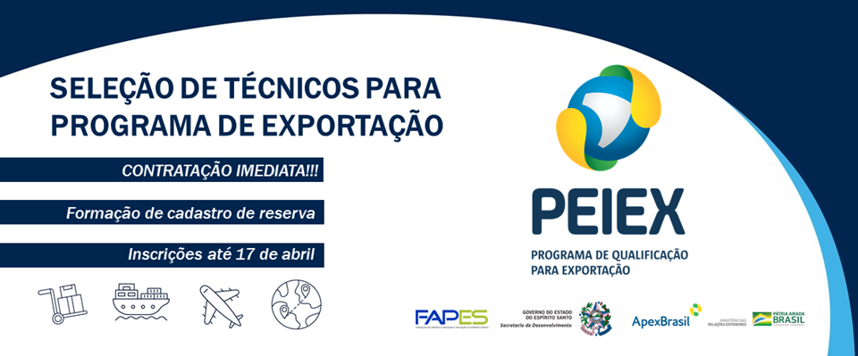 O Peiex-ES é desenvolvido pela Agência Brasileira de Promoção de Exportação e Investimentos (Apex) em parceria com o Governo do Estado, por meio da Secretaria de Desenvolvimento (Sedes). A gestão, a contratação e o acompanhamento dos bolsistas são de responsabilidade da Fapes.