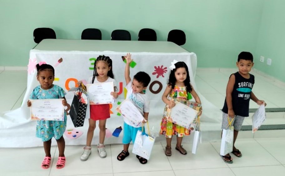 Soma-se a isso a ideia de transformar em identidade visual. Os três primeiros colocados selecionados pelos Municípios, em Exposição de Artes nos territórios, possibilitando um ambiente lúdico e propício ao desenvolvimento biopsicossocial, fatores fundamentais para um crescimento saudável, e visibilidade à temática da Primeira Infância, utilizando espaços públicos para expor as artes infantis selecionadas reproduzidas em quadros - tamanho 80 x 60 cm, e também a reprodução em tamanho 21 x 30 cm para ser entregue às famílias dos vencedores.
