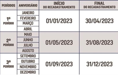 Importante lembrar que o Recadastramento de 2023 possui três períodos, sendo divididos conforme o mês de aniversário do beneficiário. Abaixo, segue tabela detalhada.