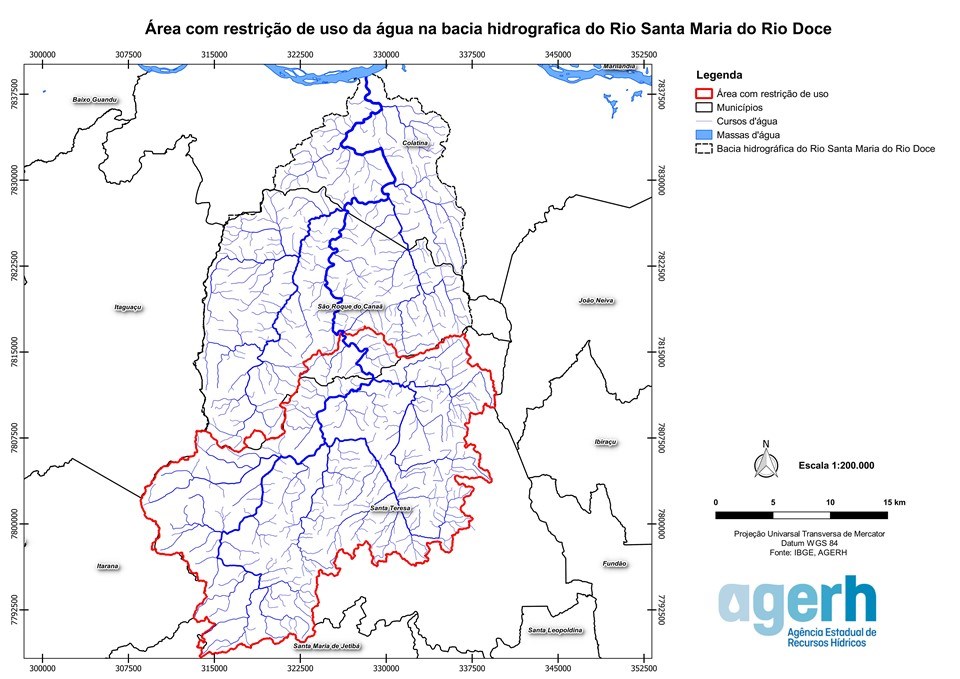 A resolução estabelece restrições para captação de água superficial e subterrânea nos mananciais inseridos na Bacia do Rio Santa Maria do Doce, que se localizam acima do ponto de captação de água da Companhia Espírito Santense de Saneamento (Cesan) nas coordenadas UTM 326313/7815826.