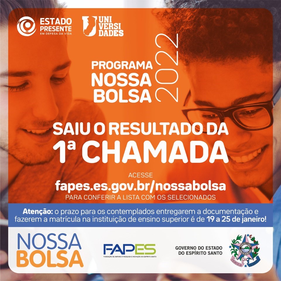 Os selecionados nesta fase do processo seletivo devem levar a documentação exigida no edital à instituição de Ensino Superior escolhida pelo candidato. O prazo para envio da documentação é de 19 a 25 de janeiro. Clique aqui e acesso o Edital Fapes 01/2022 – Programa Nossa Bolsa.