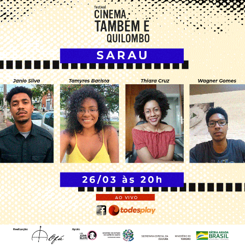 O Festival Cinema Também é Quilombo, em cartaz na Plataforma Todesplay, segue até este domingo (28), e conta com uma programação, ao vivo, com um sarau, nesta sexta-feira (26), e o masterclass de roteiro “Narrativas Afrocentradas”, neste sábado (27). Os eventos são em formato on-line e gratuitos. O Festival é uma realização da Ofá Produtora e Consultoria e conta com o apoio da Lei Aldir Blanc, da Secretaria da Cultura (Secult). A programação inclui ainda quatro mostras audiovisuais e webinários.