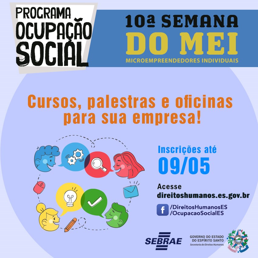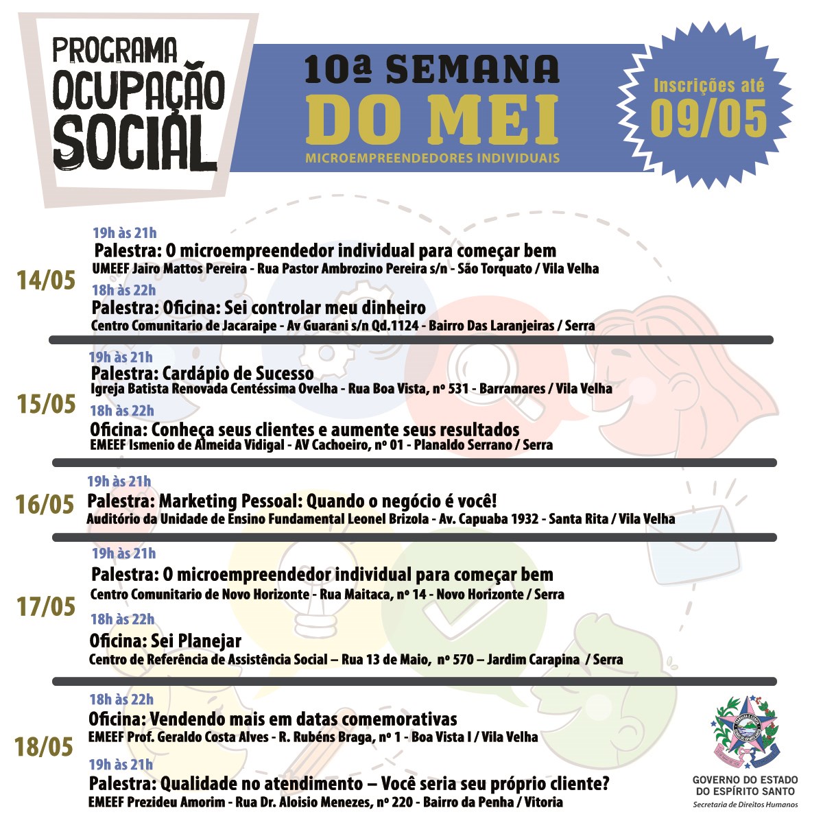 O Sebrae/ES, em parceria com a Secretaria de Estado de Direitos Humanos (SEDH), estará em nove bairros do Ocupação Social durante a 10ª Semana do Microempreendedor Individual, que será realizada de 14 a 18 de maio. As atividades vão acontecer em São Torquato, Boa Vista I, Santa Rita e Barramares, em Vila Velha; Bairro das Laranjeiras, Planalto Serrano, Novo Horizonte e Jardim Carapina, na Serra, e Bairro da Penha, em Vitória.
