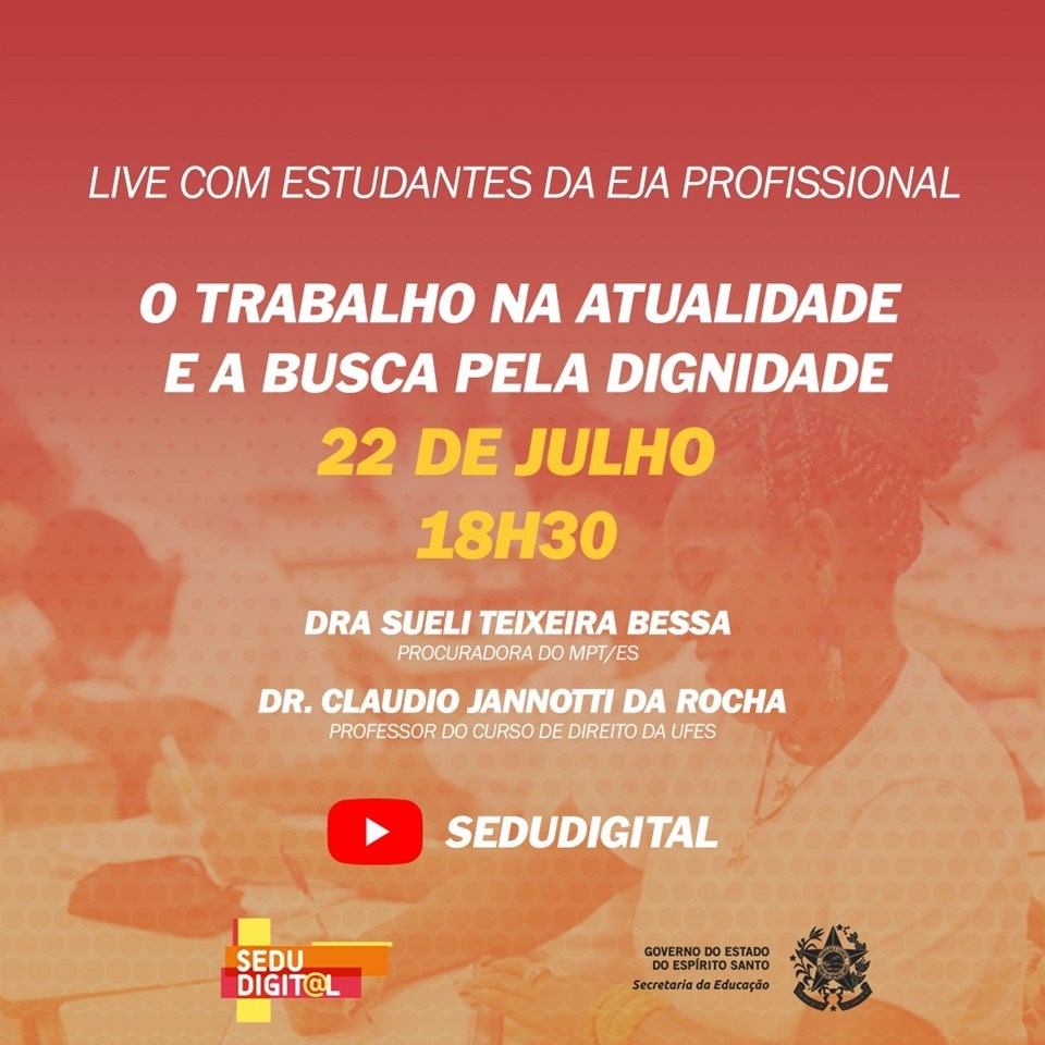 Uma live direcionada aos alunos da Educação de Jovens e Adultos (EJA) Profissional será realizada, na próxima quarta-feira (22), com o tema “O trabalho na atualidade e a busca pela dignidade”. O debate será transmitido pelo canal da Sedu Digital no YouTube.