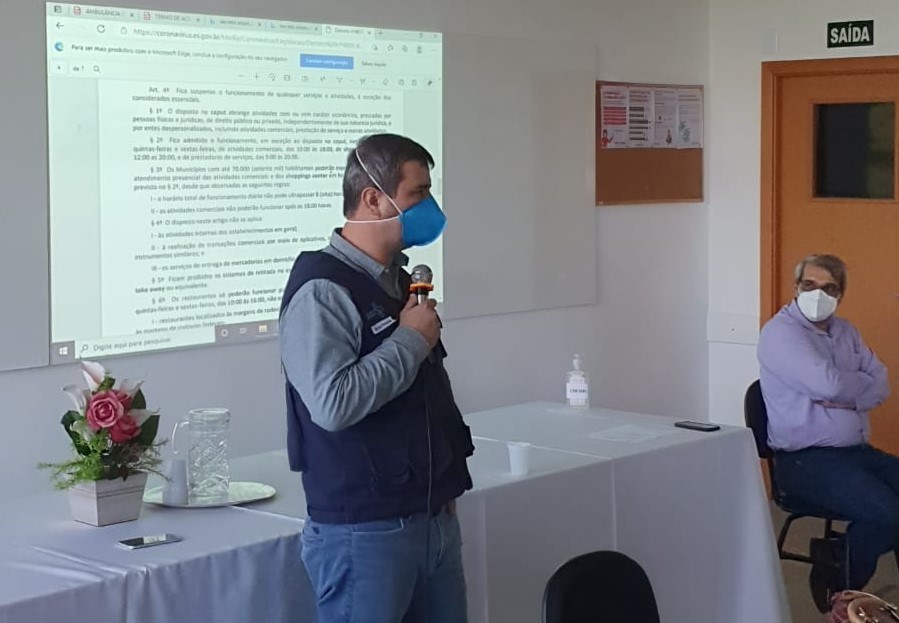 O secretário apresentou aos participantes o atual cenário da doença em solo capixaba, as projeções das próximas semanas, ampliação de leitos nos hospitais da região e discutiu sobre a aquisição de insumos para enfrentamento a pandemia. Também esteve presente o superintendente da Região Sul de Saúde, José Maria Justo.