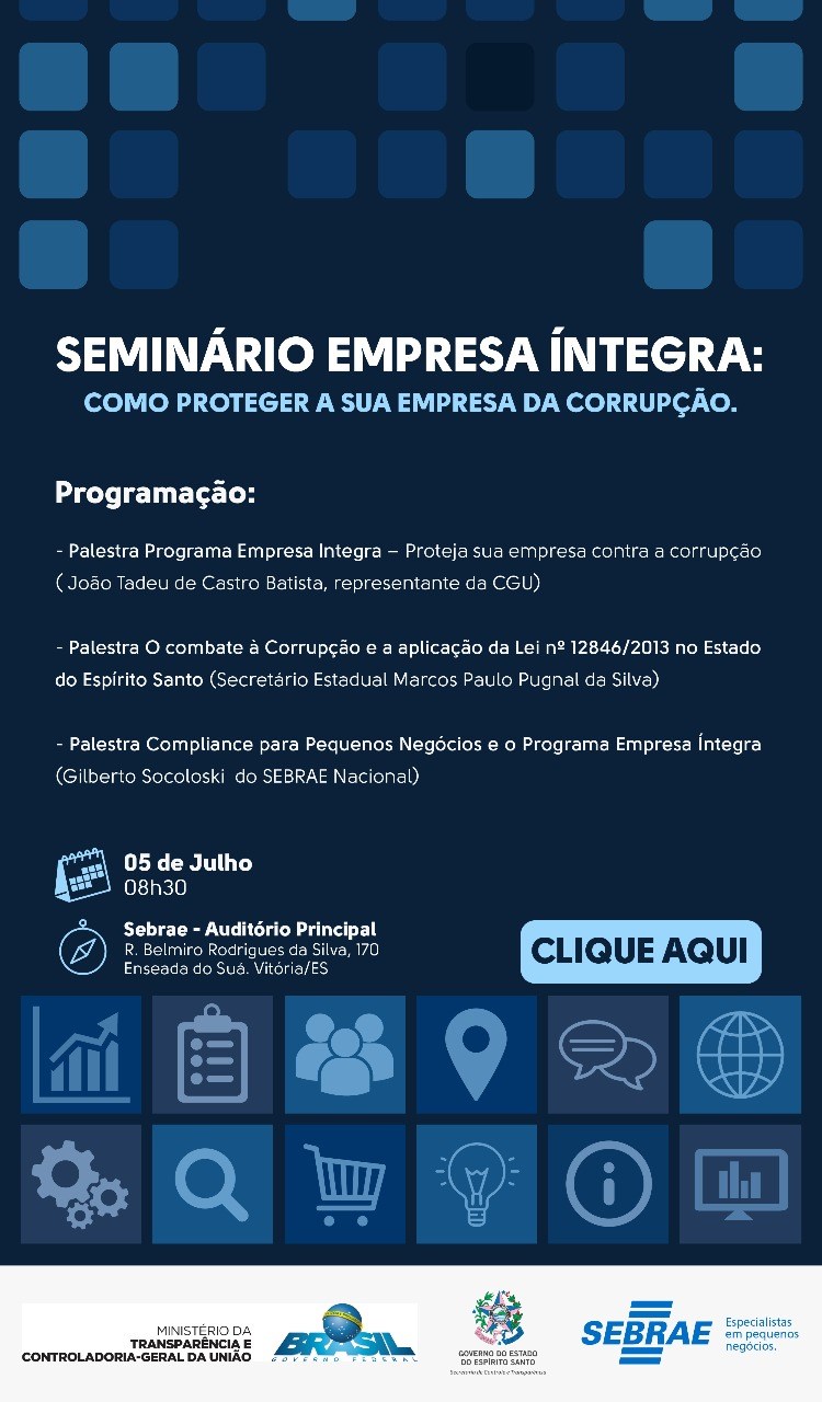 O secretário de Estado de Controle e Transparência (Secont), Marcos Pugnal, será um dos palestrantes do “Seminário Empresa Íntegra: Como Proteger a Sua Empresa da Corrupção”, que acontece nesta quinta-feira (05/07), às 8h30, no Auditório do Sebrae, em Vitória. O evento é realizado pelo Sebrae/ES e pela Controladoria-Geral da União (CGU/ES), com apoio da Secont. O público-alvo são, principalmente, micro e pequenos empresários.