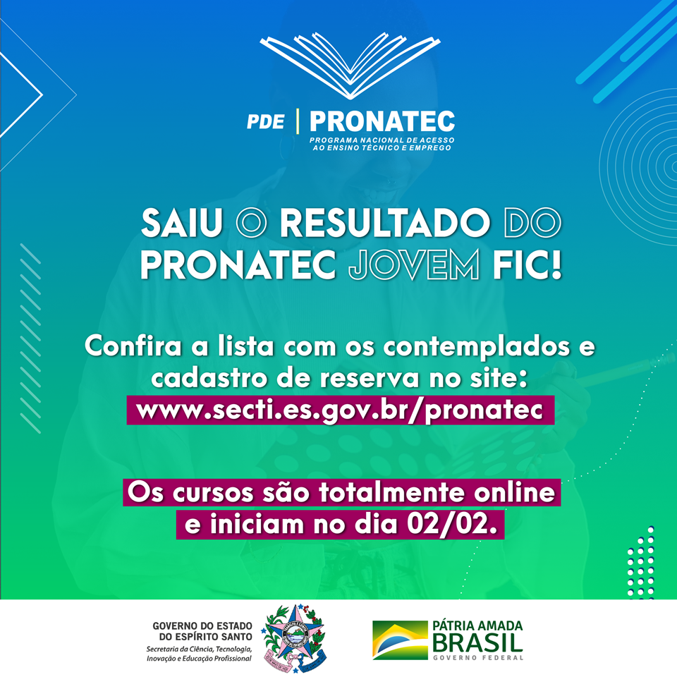 O Governo do Estado, por meio da Secretaria da Ciência, Tecnologia, Inovação e Educação Profissional (Secti), divulga o resultado da primeira oferta de vagas disponibilizadas pelo Pronatec Jovem Fic. A oferta deu início ao calendário de vagas de cursos profissionalizantes no Espírito Santo em 2021. Ao todo, 200 vagas foram distribuídas em 12 municípios do Estado para cursos on-line e 648 pessoas disputaram as vagas.