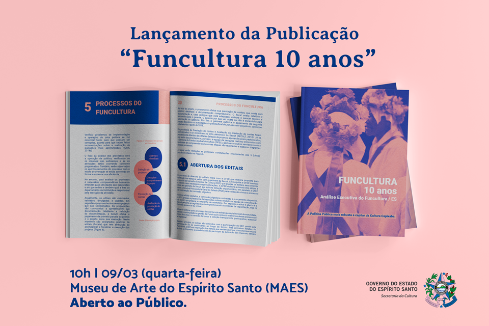 O Fundo de Cultura do Espírito Santo (Funcultura) é o principal mecanismo do Governo do Estado para o fomento e incentivo aos projetos e ações culturais no Espírito Santo. Para celebrar os 10 anos de atividade do Fundo, a Secretaria da Secult (Secult) lança a publicação “Funcultura 10 anos – Análise executiva do Funcultura”, no próximo dia 09 de março, às 10 horas, no auditório do Museu de Arte do Espírito Santo Dionísio Del Santo (MAES), no Centro de Vitória. A entrada é aberta ao público.