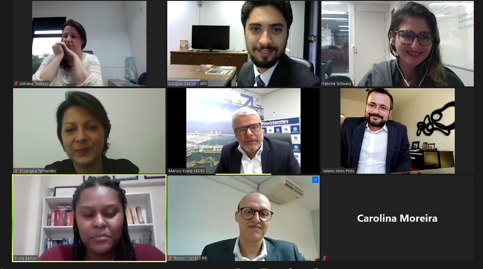 Também participaram da reunião virtual os representantes da Secretaria de Desenvolvimento Econômico de Minas Gerais, Juliano Alves Pinto e Douglas Cabido; da Secretaria de Desenvolvimento Econômico, Ciência, Tecnologia e Inovação do Estado de São Paulo, Bruna Barros e Adriana Tedesco; da Secretaria de Desenvolvimento Econômico e Turismo do Rio Grande do Sul, Elisangela Fernandes; e o diretor-técnico do Invest Paraná, Giancarlo Rocco.