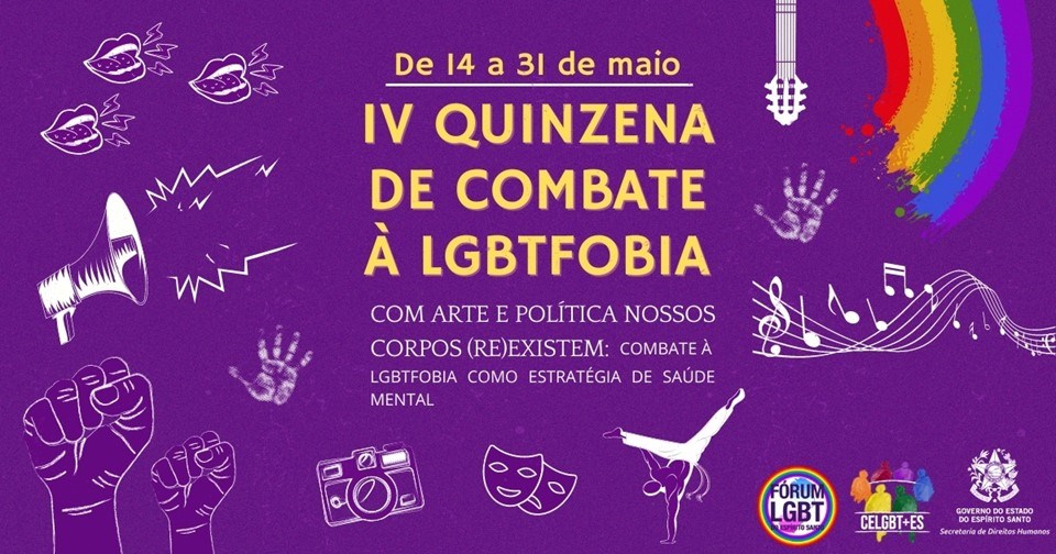 O Fórum Estadual LGBT, o Conselho Estadual LGBT+ e a Secretaria de Direitos Humanos (SEDH), por meio da Gerência de Políticas de Diversidade Sexual e Gênero, realizam a IV Quinzena de Combate à LGBTFobia em parceria com diversos coletivos e instituições capixabas, com uma programação que começa nesta sexta-feira (14). O tema deste ano é "Com arte e política nossos corpos re (existem): Combate à LGBTfobia como estratégia de saúde mental".
