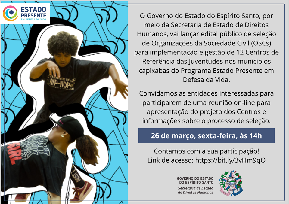 O Governo do Estado do Espírito Santo, por meio da Secretaria de Direitos Humanos (SEDH), vai lançar um edital público de seleção de Organizações da Sociedade Civil (OSCs) para implementação e gestão de 12 Centros de Referência das Juventudes (CRJs) nos municípios capixabas do Programa Estado Presente em Defesa da Vida.