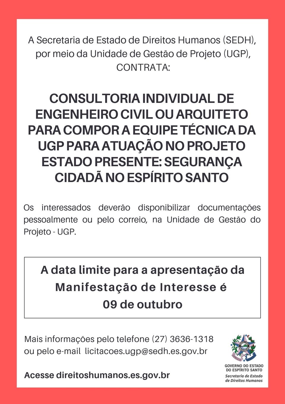 Nesta sexta-feira (27), a Secretaria de Estado de Direitos Humanos (SEDH), por meio da Unidade de Gestão de Projeto (UGP), publicou mais uma manifestação de interesse no Diário Oficial do Espírito Santo. Desta vez, a contratação é para serviços de Consultoria Individual de Engenheiro Civil ou Arquiteto para compor a equipe técnica da UGP para atuação no “Estado Presente: Segurança Cidadã no Espírito Santo”.