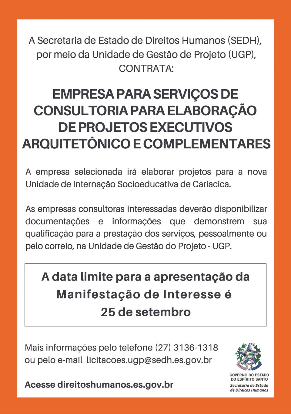 Nesta terça-feira (10), a Secretaria de Estado de Direitos Humanos (SEDH), por meio da Unidade de Gestão de Projeto (UGP), publicou no Diário Oficial do Espírito Santo a Manifestação de Interesse para a contratação de serviços de consultoria para elaboração de projetos executivos arquitetônico e complementares, assim como outros serviços de engenharia, para a nova Unidade de Internação Socioeducativa de Cariacica.