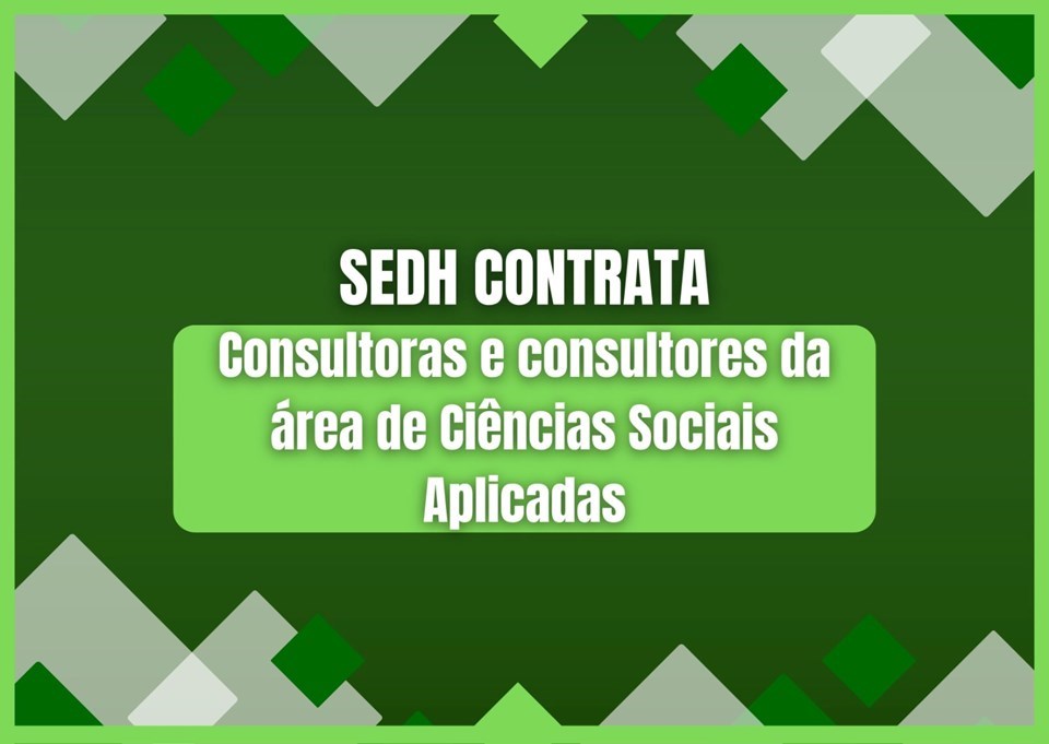 A Secretaria de Direitos Humanos (SEDH), por meio da Unidade Gestora de Projetos (UGP), está contratando dois consultores com graduação na área de Ciências Sociais Aplicadas. O valor mensal por 40 horas semanais é de R$ 7.693,75. As inscrições podem ser feitas até o dia 14 de agosto.