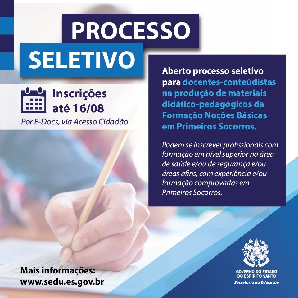 O processo seletivo visa à contratação de profissionais para atendimento às demandas, com a finalidade de atuarem como docentes-conteudistas na produção de materiais didático-pedagógicos da Formação Noções Básicas em Primeiros-Socorros.