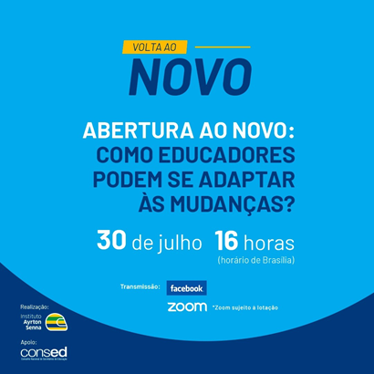 A Secretaria da Educação (Sedu), em parceria com o Conselho Nacional de Secretários de Educação (Consed), por meio do Centro de Formação de Profissionais da Educação do Espirito Santo (Cefope) e do Instituto Ayrton Senna (IAS), realiza, nesta quinta-feira (30), às 16 horas, a live "Abertura ao novo: como educadores podem se adaptar às mudanças?", no Facebook do Instituto Ayrton Senna (@instituroayrtonsenna).