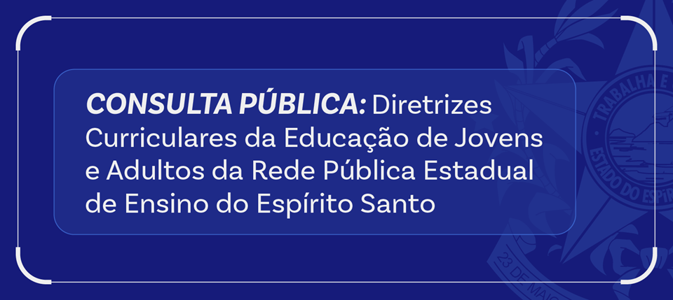 A Secretaria da Educação (Sedu), por meio da Gerência de Educação de Jovens e Adultos (GEEJA), divulga, nesta segunda-feira (28), a segunda etapa da Consulta Pública da minuta do documento que atualiza as Diretrizes Curriculares da Educação de Jovens e Adultos do Espírito Santo. O documento-base estará disponível para consulta até o dia 29 de setembro, exclusivamente via de formulário eletrônico (Clique AQUI).