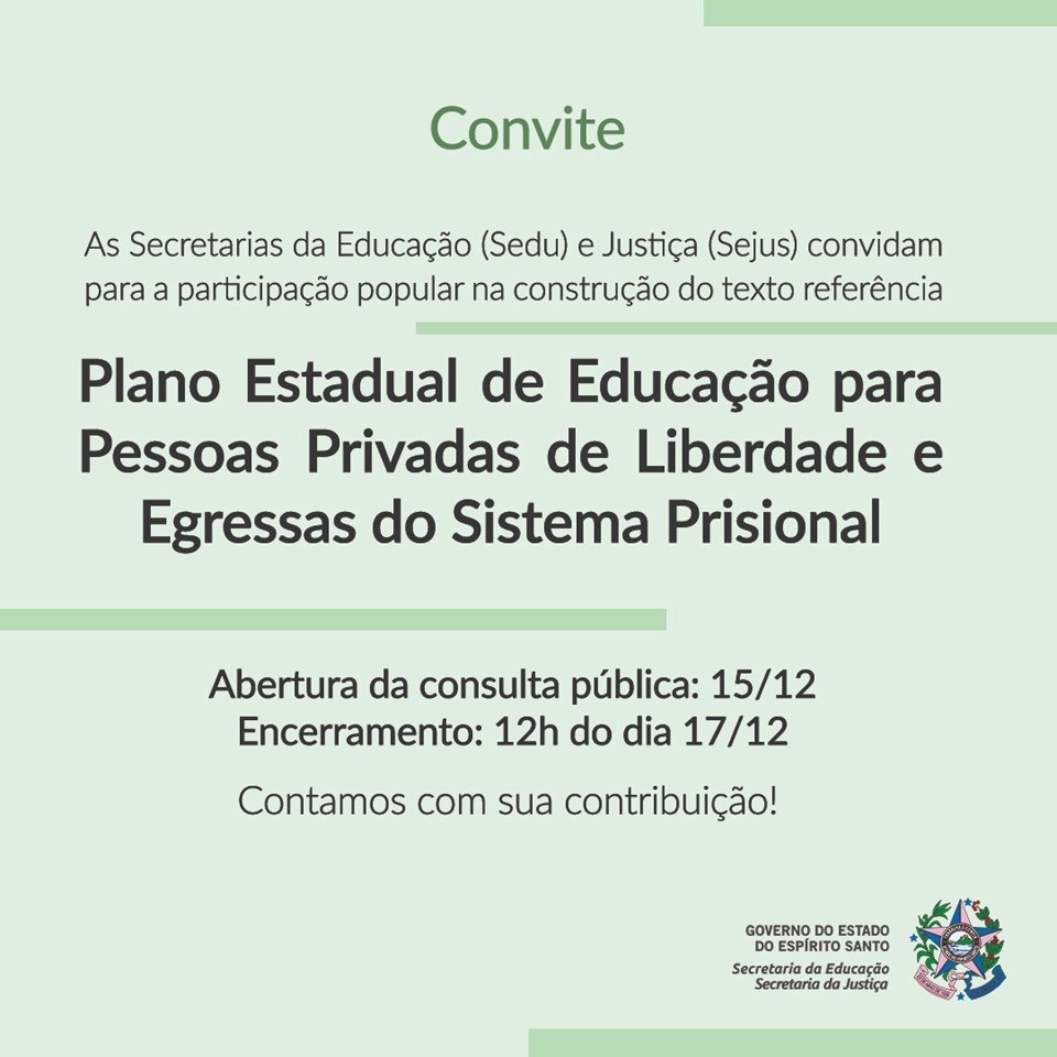 As Secretarias da Educação (Sedu) e da Justiça (Sejus) abriram Consulta Pública para a participação popular na construção do texto referência do Plano Estadual de Educação para Pessoas Privadas de Liberdade e Egressas do Sistema Prisional (PEEP/ES). Para contribuir clique AQUI.