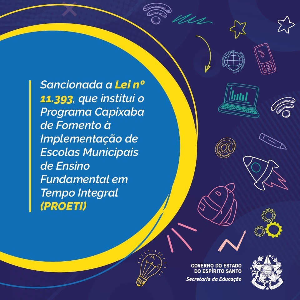A Secretaria da Educação (Sedu) instituiu o Programa Capixaba de Fomento à Implementação de Escolas Municipais de Ensino Fundamental em Tempo Integral (PROETI), por meio da Lei nº 11.393, publicada no Diário Oficial do Espírito Santo, desta quarta-feira (08).
