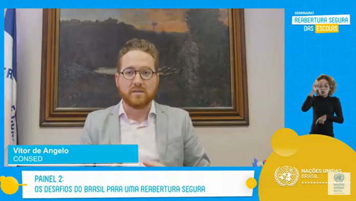 O secretário de Estado da Educação, Vitor de Angelo, participou, nesta quarta-feira (07), do Seminário Reabertura Segura das Escolas, promovido pelas agências da Organização das Nações Unidas (ONU) no Brasil. O evento teve como objetivo discutir os impactos do fechamento das escolas e os desafios que o Brasil enfrenta para garantir uma reabertura segura e sustentável.
