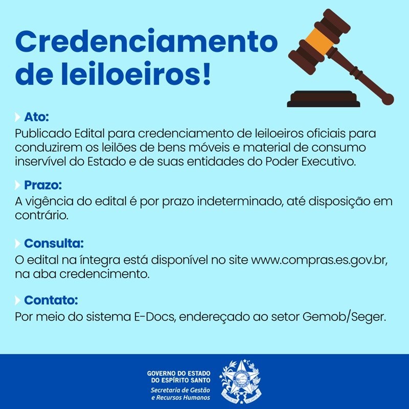 A Secretaria de Gestão e Recursos Humanos (Seger) publicou, nesta quinta-feira (29), no Diário Oficial do Estado, o Edital de Credenciamento de Leiloeiro Oficial de Bens Móveis Nº 01/2024.
