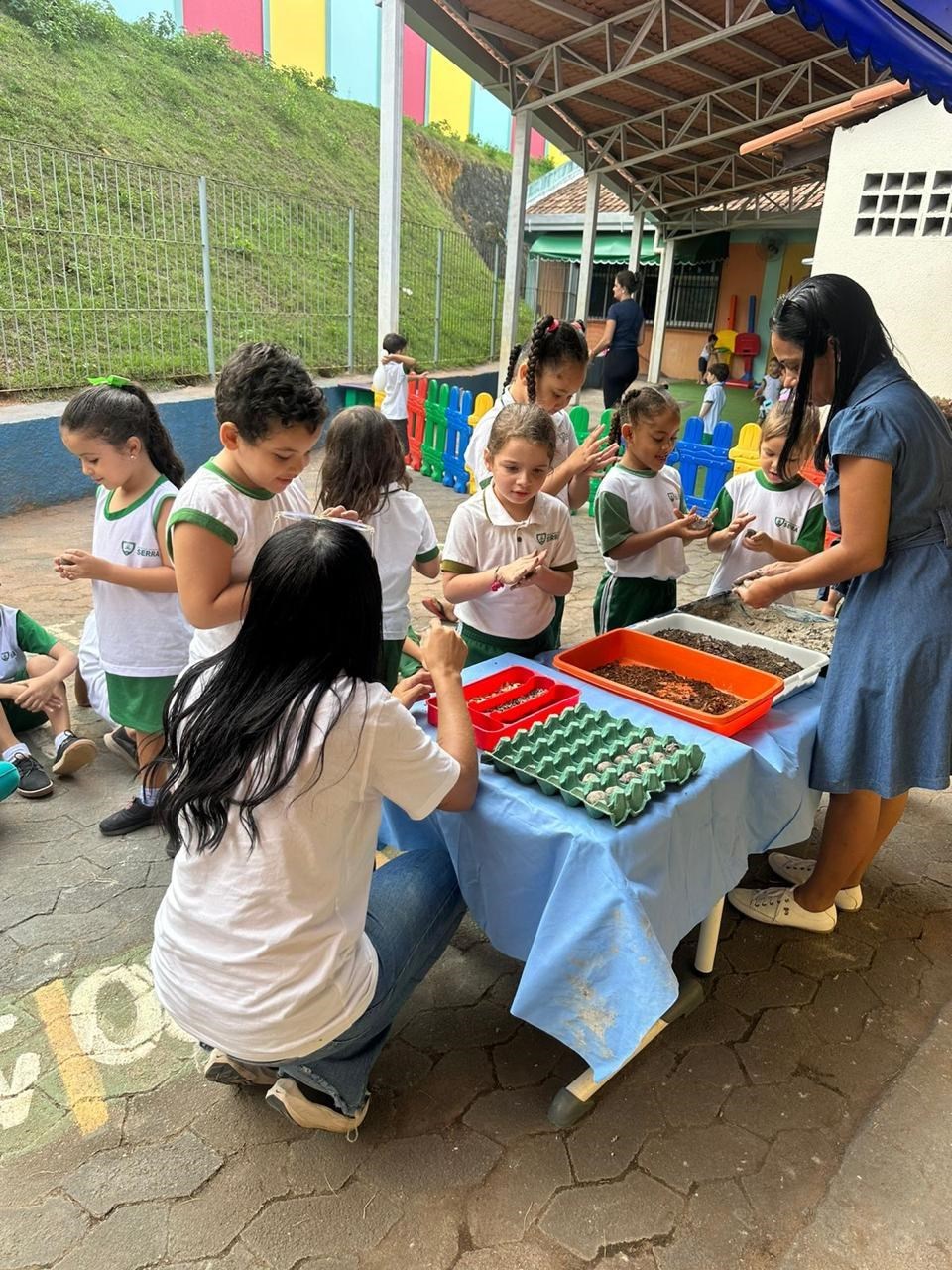 Durante as sessões nas escolas, as crianças têm a oportunidade de mergulhar nas etapas práticas do processo. Guiadas pela analista ambiental, elas aprendem sobre os ingredientes necessários para produzir o composto orgânico e participam ativamente na confecção das ‘bombas de semente’.
