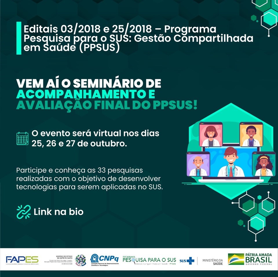 Pesquisas científicas e tecnológicas com foco na melhoria do Sistema Único de Saúde (SUS) do Espírito Santo é o que os participantes do Seminário de Acompanhamento e Avaliação Final de editais do Programa Pesquisa para o SUS: Gestão Compartilhada em Saúde (PPSUS) vão debater na próxima semana. A Fundação de Amparo à Pesquisa e Inovação do Espírito Santo (Fapes) vai realizar o evento nos dias 25, 26 e 27 de outubro, de forma on-line e aberta ao público.