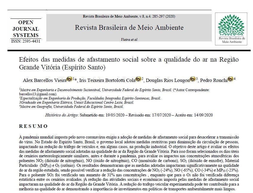 Com o título “Efeitos das medidas de afastamento social sobre a qualidade do ar na Região Grande Vitória”, o artigo de quatro servidores do Instituto Estadual de Meio Ambiente e Recursos Hídricos (Iema) foi aceito e publicado na Revista Brasileira do Meio Ambiente, importante publicação científica da área ambiental. O estudo avalia os efeitos das medidas de distanciamento social na qualidade do ar da Região da Grande Vitória e foi produzido pelos servidores Alex Barcellos Vieira, Iris Teixeira Cola, Douglas Rios Lougon e Pedro Ronchi.