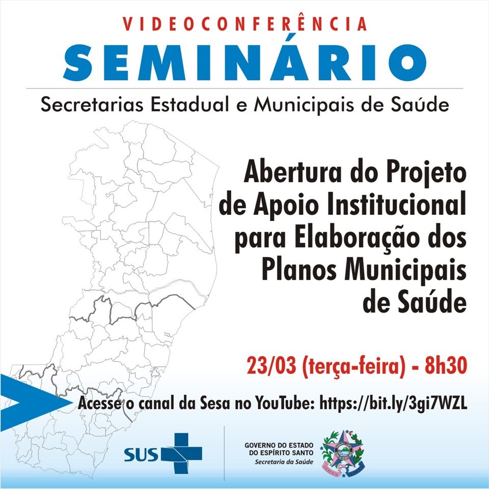 A Secretaria da Saúde (Sesa) realiza, nesta terça-feira (23), o seminário de abertura do Projeto de Apoio Institucional para Elaboração dos Planos Municipais de Saúde (2022-2025). A abertura do evento terá a presença do governador do Estado, Renato Casagrande, e do secretário de Estado da Saúde, Nésio Fernandes.