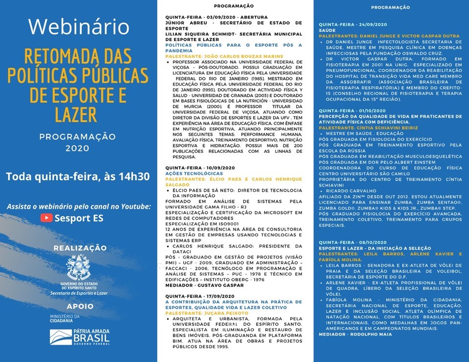 A palestra de abertura do webinário abordou o tema “Políticas públicas para o esporte pós-pandemia” e foi conduzida pelo mestre em Educação Física pela Universidade do Rio de Janeiro (UFRJ), João Carlos Bouzas Marins. Já na semana seguinte, o diretor da Cia de Tecnologia da Informação (Dataci), Élcio Paes Neto, trouxe a experiência dele ao falar sobre “Ações Tecnológicas”.