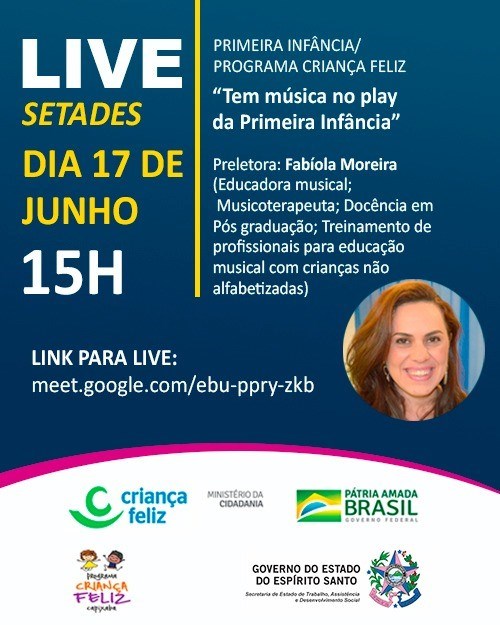 A live será realizada pelo Google Meet e tem como finalidade colaborar com profissionais da rede socioassistencial e, principalmente, com os profissionais do Programa Criança Feliz. Na live será feita a apresentação de atividades lúdicas de estimulação das dimensões do desenvolvimento infantil (socioafetiva, cognitiva, motora e de linguagem/comunicação), por meio da música.