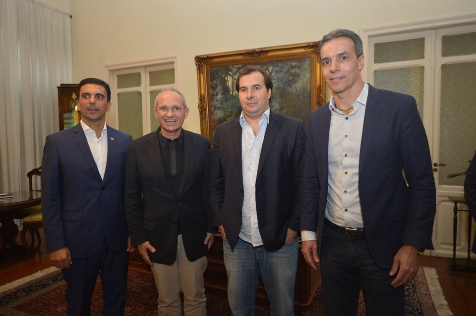 Em visita ao Espírito Santo, o presidente interino do país, Rodrigo Maia, participou de reunião com o governador Paulo Hartung e empresários capixabas. O encontro aconteceu na tarde desta sexta-feira (1º), no Palácio Anchieta, e contou com a presença de empresários do setor de rochas ornamentais e também de outros segmentos, tais como indústria naval, celulose e portuário.