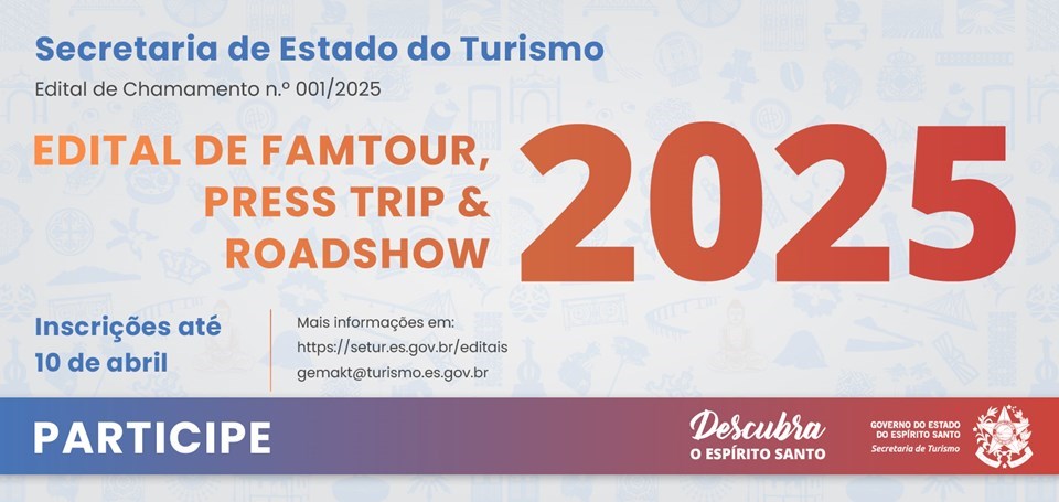 O Governo do Estado, por meio da Secretaria do Turismo (Setur), lançou o Edital de Chamamento Público nº 001/2025 para seleção de propostas de apoio à realização de Famtours, Press Trips e Roadshows. O objetivo é divulgar o turismo do Estado por meio da participação de agentes de viagens, jornalistas, blogueiros e influenciadores digitais. Os interessados podem enviar as propostas a partir desta quarta-feira (12) até o dia 10 de abril.