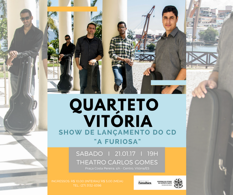 Representantes da nova geração de violonistas capixabas, o Quarteto Vitória lança, no próximo dia 21 de janeiro, o seu primeiro CD: “A Furiosa”. O show será no Teatro Carlos Gomes, no Centro de Vitória, às 19 horas. Uma valiosa dica para os adeptos dos sons mágicos do violão. O álbum foi contemplado pelo Funcultura por meio do Edital Nº 014/2015 - Seleção de Projetos Culturais Setoriais de Música da Secretaria de Estado da Cultura (Secult).