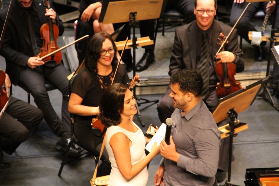 O solista convidado disse que a música inspira o amor, e perguntou se havia alguém que queria aproveitar o espaço para se declarar. A advogada Jaqueline Avelar levantou a mão e foi convidada pelo maestro para subir ao palco.