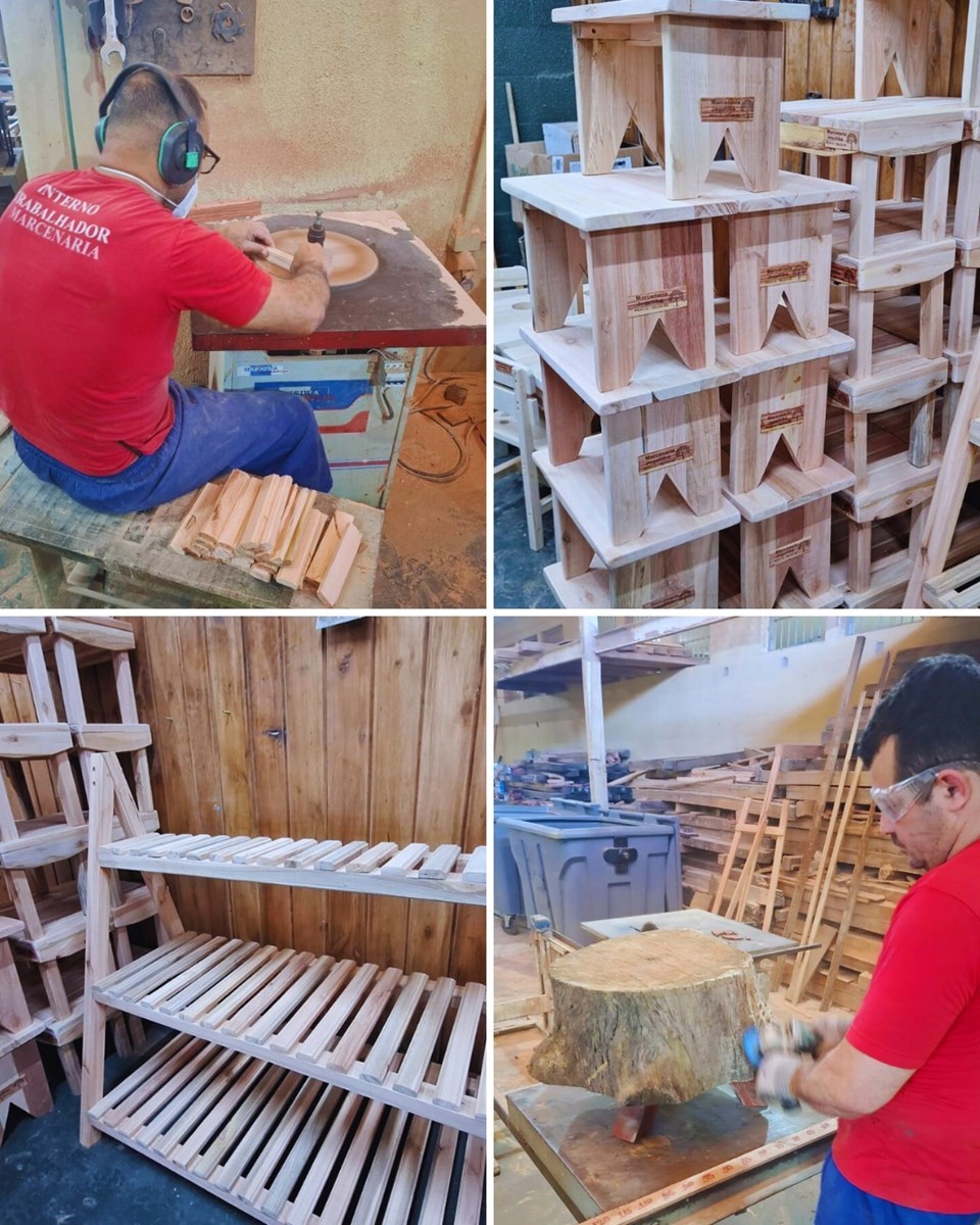As peças são produzidas na Marcenaria Jequitibá, que funciona na Penitenciária Estadual de Vila Velha 3 (PEVV3), no Complexo Penitenciário Eduardo Pereira da Silva. Na oficina, trabalham sete internos que receberam capacitação para o ofício de marceneiro.