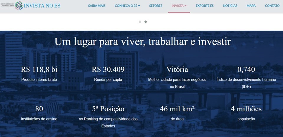 Há também informações sobre potencial turístico, cultura, culinária e esporte. A página apresenta dados que justificam o setor privado investir no Estado, como a criação do Fundo Soberano e a atuação do Banco de Desenvolvimento do Espírito Santo (Bandes) na concessão de crédito.
